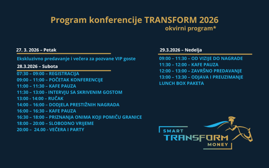 Na konferenciji TRANSFORM 2026 imat ćete priliku biti dio pokreta, koji mijenja industrije i živote. Ovo je događaj na kojem ćete steći uvid u najnovije trendove, tehnologije i strategije, koje će oblikovati svijet sutrašnjice. Očekuju vas ekskluzivni govornici, radionice i prilike za umrežavanje. Iskustvo, koje će nadmašiti sva vaša očekivanja!